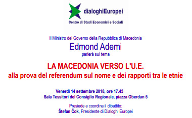 Il prossimo 30 settembre i macedoni di Skopje saranno chiamati a esprimersi sull'intesa di Prespa in un importante referendum. Il sì dell'elettorato nella consultazione popolare sbloccherebbe definitivamente ogni ostacolo posto dalla Grecia all'integrazione della Macedonia nella Ue (e nell'Alleanza atlantica). Ma l'accordo raggiunto tra i governi è meno scontato nell'opinione pubblica dei due paesi. Anzi: sta suscitando proteste in ambedue Paesi. Un gruppo di oltre 70 influenti studiosi e intellettuali macedoni e stranieri ha sottoscritto una lettera aperta molto critica verso gli accordi di Prespa e contro il cambio di nome. La prima firma sulla lettera, sottoposta all'attenzione dei media locali e internazionali, è quella della professoressa e politologa Biljana Vankovska, seguita dall'accademico James Pettifer (Università di Oxford). Fra i firmatari della missiva, c'è anche lo scrittore di fama mondiale Milan Kundera. In Grecia non sono mancate fortissime manifestazioni di piazza per quella che viene considerata un'abdicazione. Ma questo non è il solo problema che rende attuale l'incontro con il ministro Ademi. La Macedonia è un Paese etnicamente plurale i rapporti tra le etnie hanno contrassegnato in misura significativa le vicende politiche del Paese. Da ciò l'attualità dell'incontro con l'esponente di un governo che non fa mistero di voler accelerare le riforme che consentano al Paese l'adesione all'Unione europea entro i prossimi sette-otto anni.
