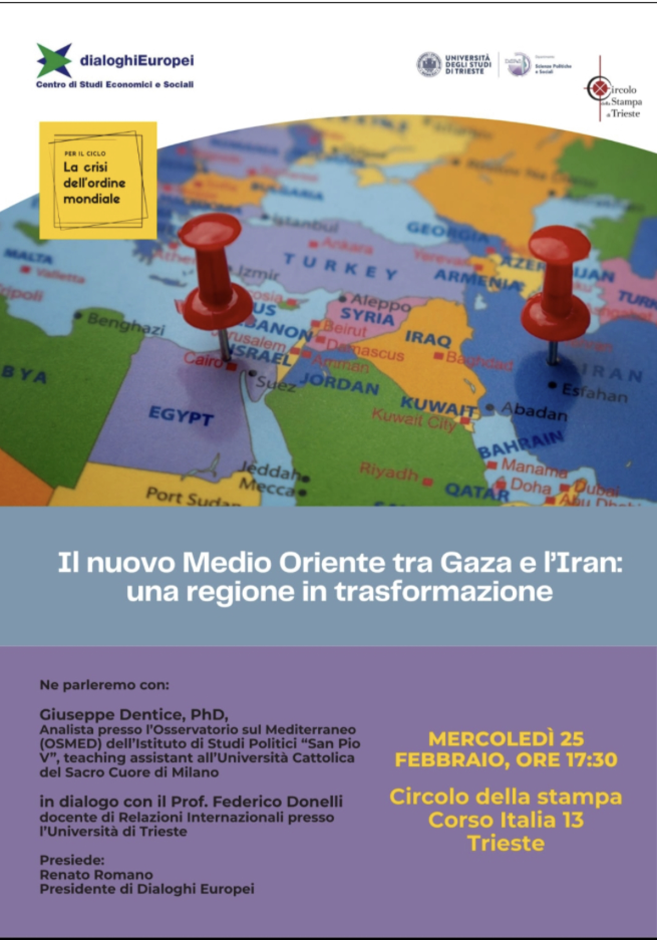 Dialoghi Europei, nell’ambito del ciclo di conferenze dedicato a “La crisi dell’ordine mondiale”, organizza un incontro sul tema “Il nuovo Medio Oriente tra Gaza e l’Iran: una regione in trasformazione”.