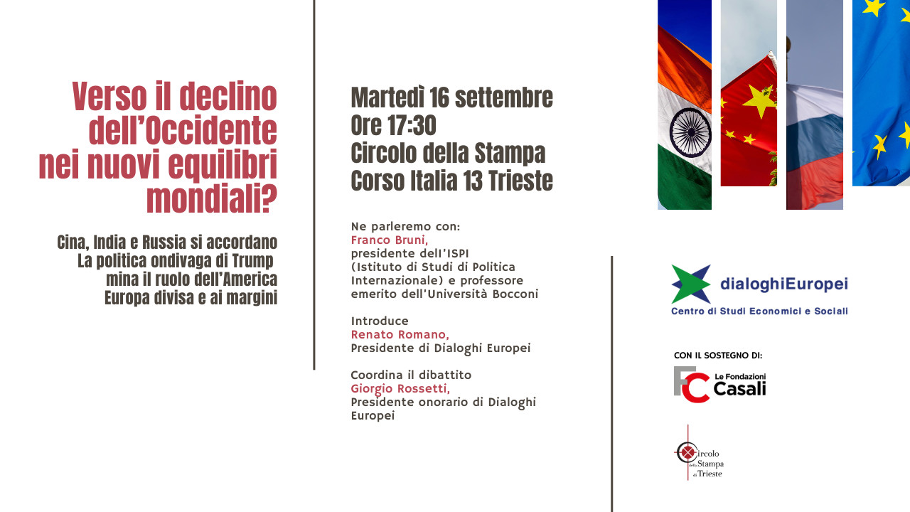 Il primo appuntamento dal titolo “Verso il declino dell’occidente nei nuovi equilibri mondiali?” è previsto per martedì 16 settembre alle 17:30 presso il Circolo della Stampa di Trieste.