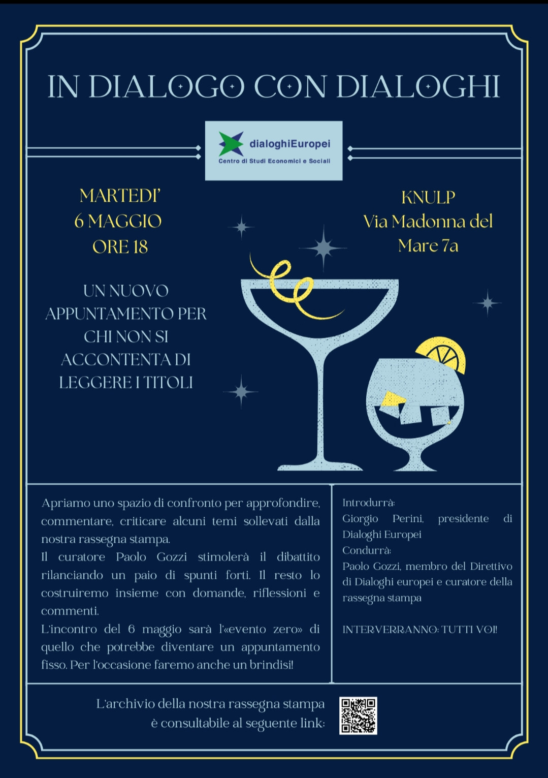 Prenderemo un aperitivo insieme e insieme dialogheremo con Paolo Gozzi, su alcuni temi della nostra rassegna stampa, di cui è curatore.